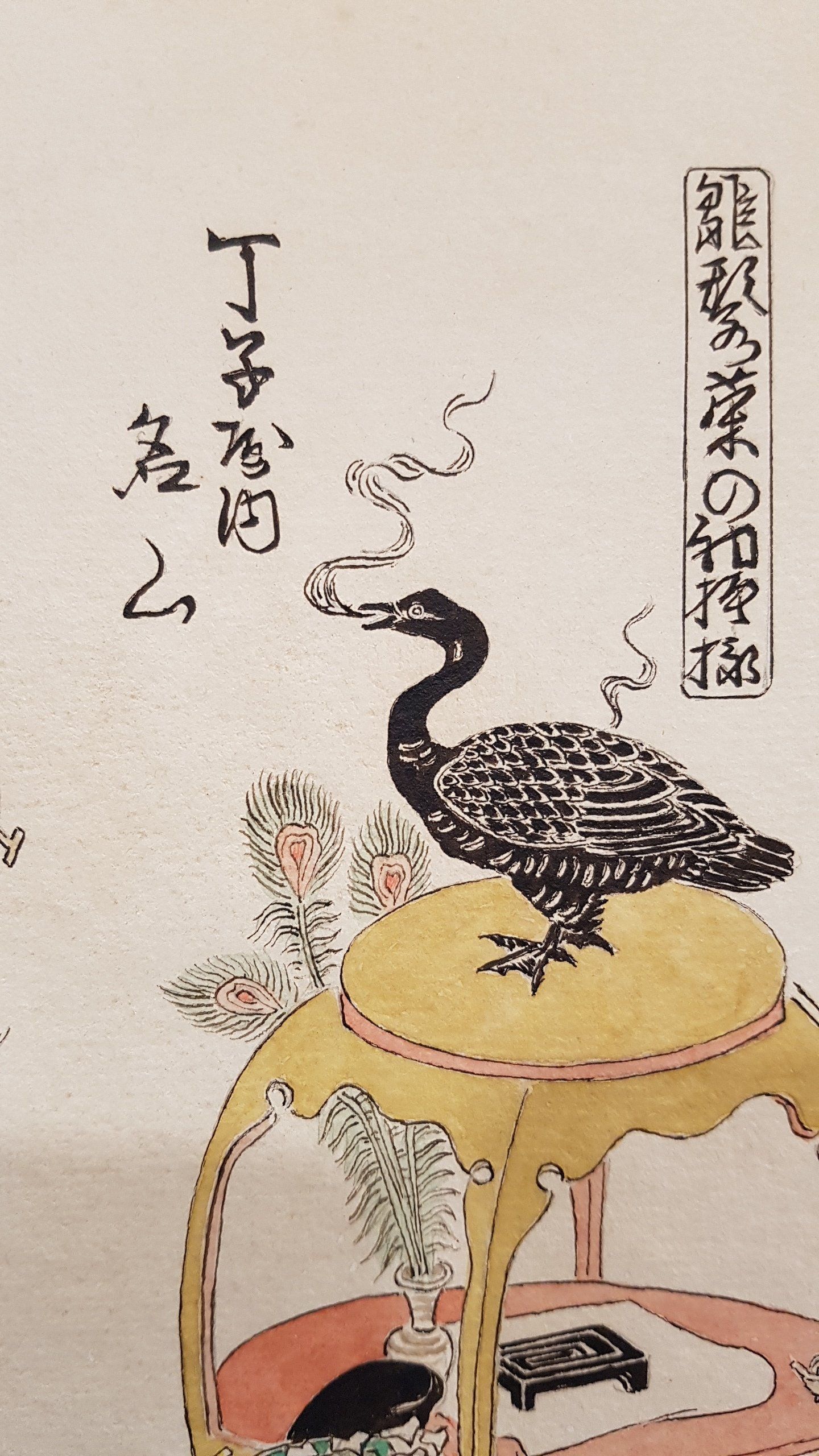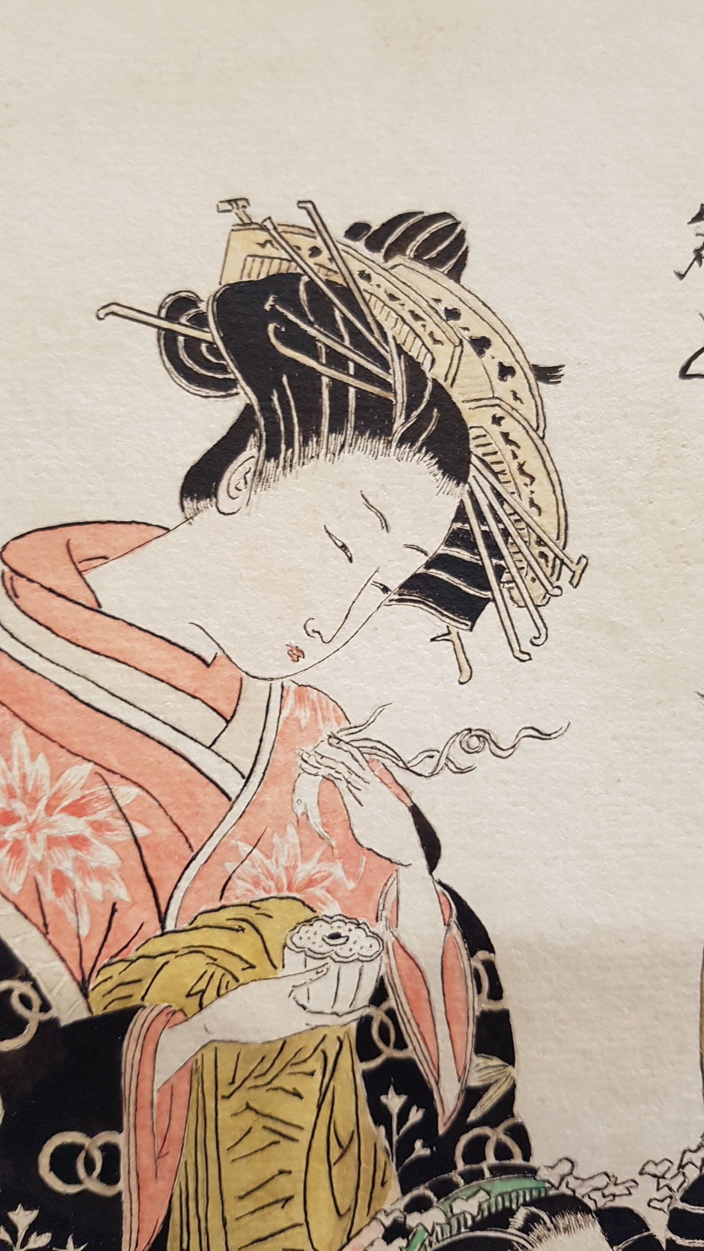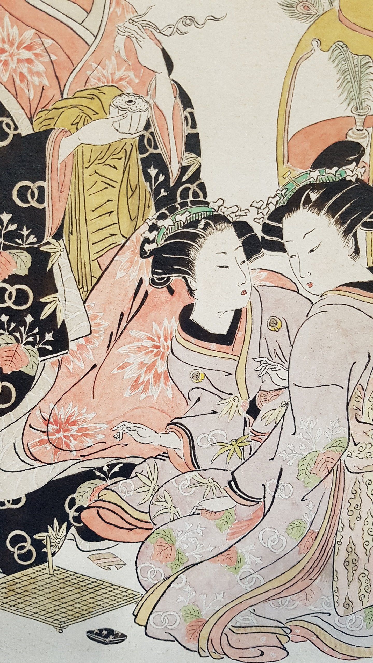 Cette gouache en bon état est très raffinée par les soins apportés à la représentation des kimonos, ou encore des traits des personnages