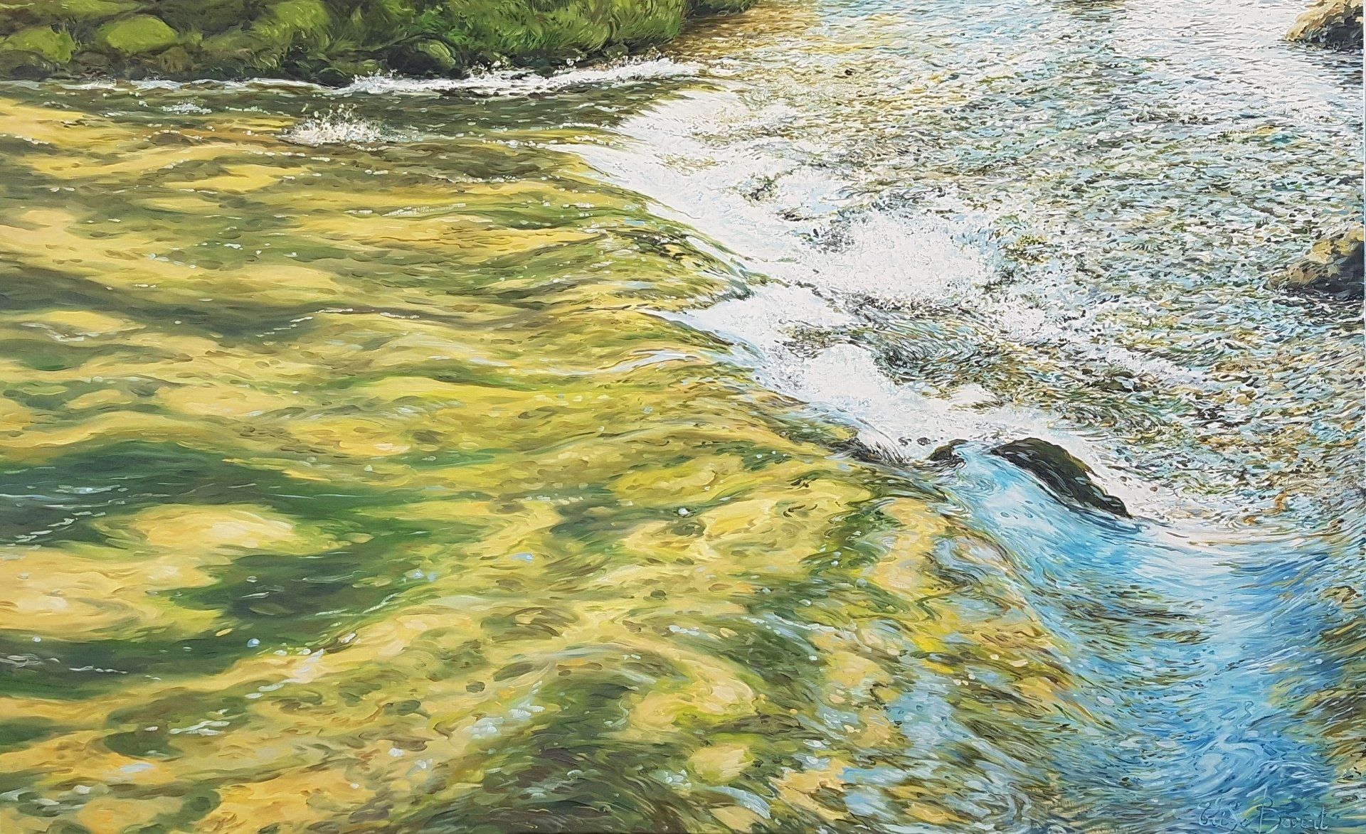Ma peinture ne cherche cependant pas à faire passer de message critique, ou à mettre en avant un concept au détriment de la perception et de l’émotion. Je préfère évoquer des visions sereines, propices à l’imaginaire et au rêve. J’aime créer des paysages différents, où le ciel, l’eau, les fonds et le végétal se mêlent pour questionner notre rapport au visible.